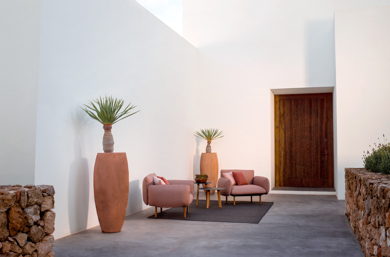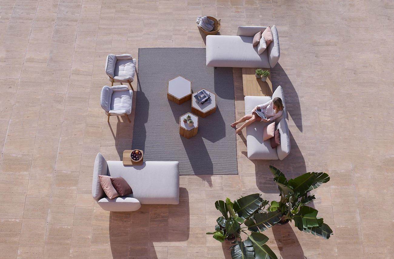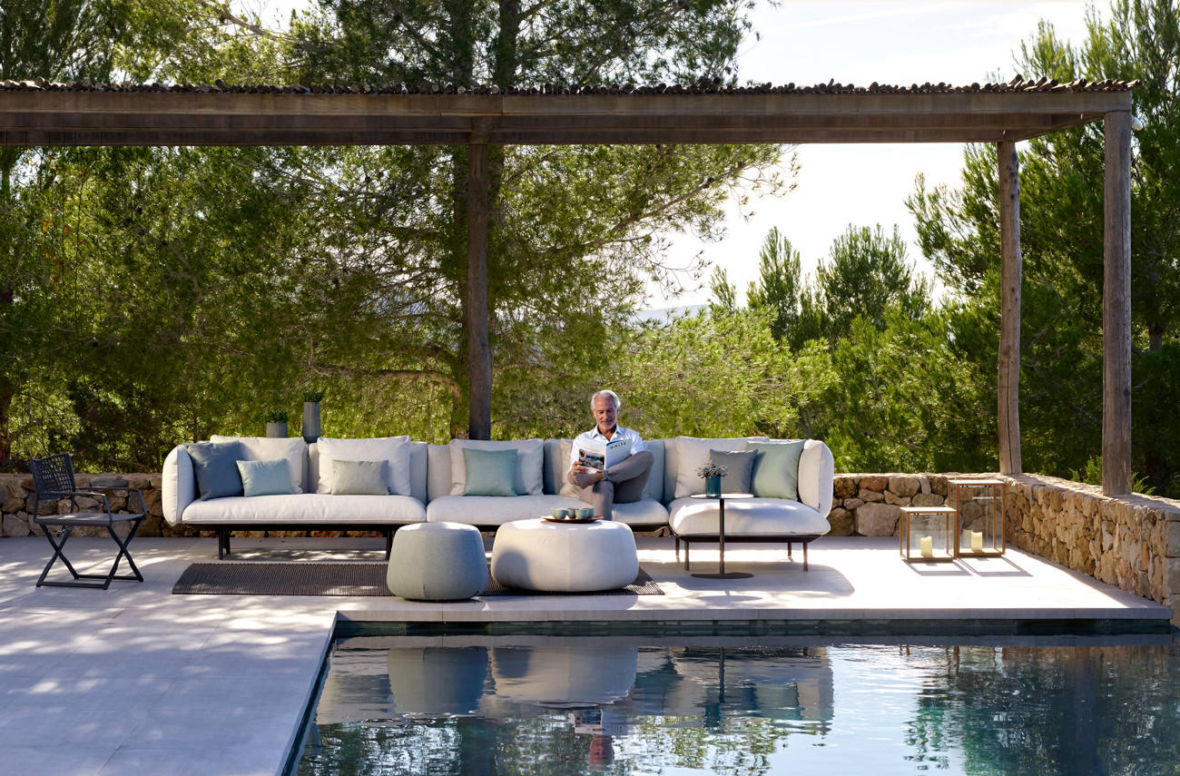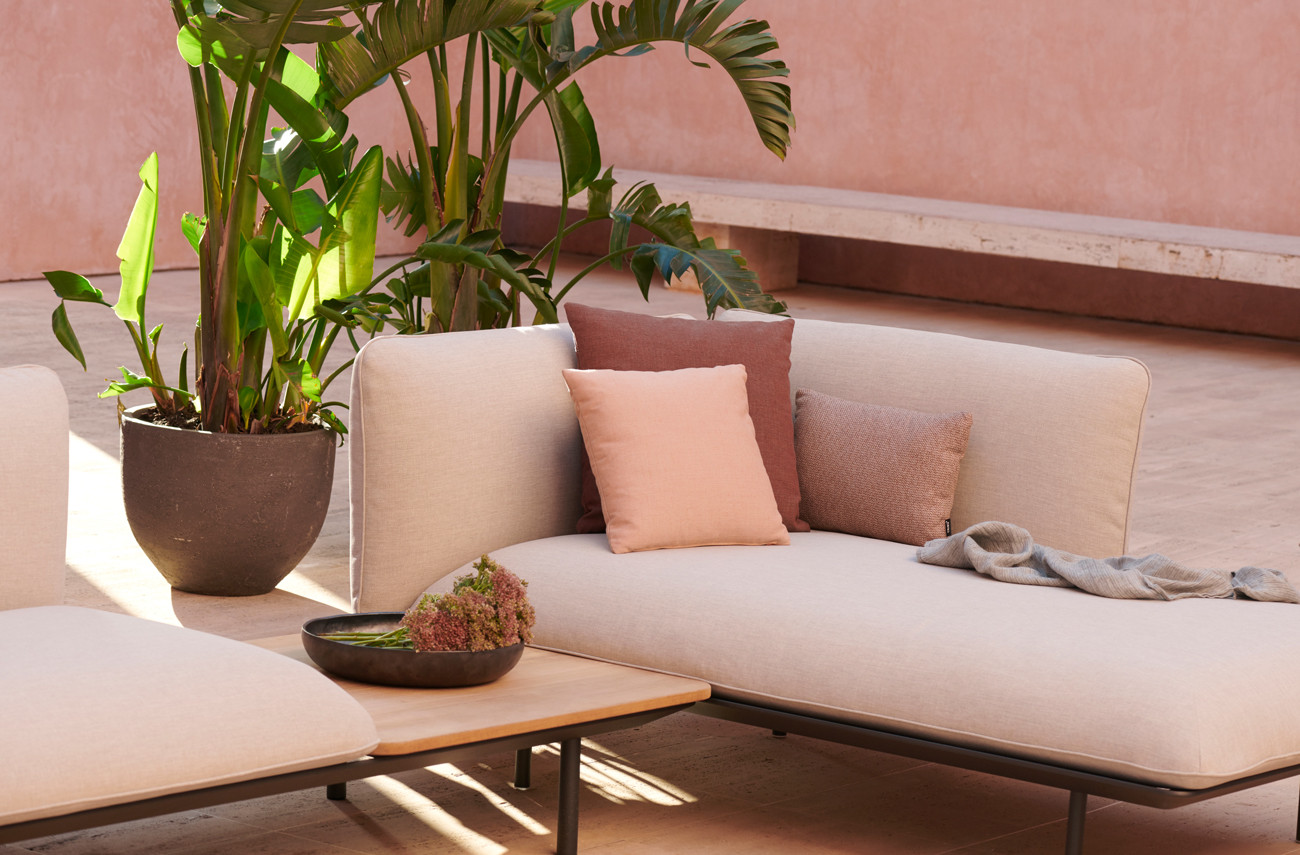 Curl up and relax on the modular Senja sofa. The highly flexible design invites you to combine one-, two- or three-seater modules with either high or low arms. Choose the color of the legs and keep everything at hand with an integrated table top, side table or slim console table with a top in teak or glazed lava stone. Senja comes with regular and extra-deep cushions for extra lounge comfort. The Nordic-style cushions are finished with a piped seam and can easily withstand a sudden downpour, thanks to the ventilating, water-repellent filling. The seams of the filling are protected with an extra inside cover and the thread used to stitch the seams swells when wet, further preventing water from entering. As for the colors, you can choose from more than 100 nature-inspired outdoor fabrics.